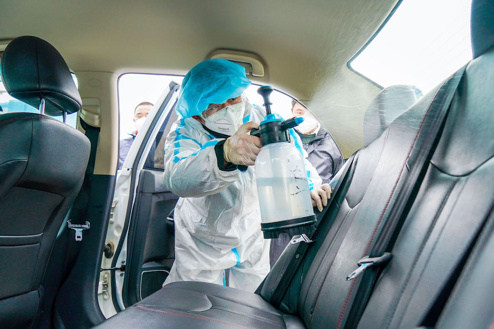 ,为滴滴司机们发放口罩和消毒物资,并协助师傅们进行车辆消毒。一起,