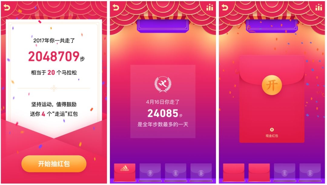 QQ会显现用户2017年在QQ运动中堆集的总步数,和一份专属小总结,还能收取四个“走运红包”,为自己曩昔一年的健康运动点赞。
