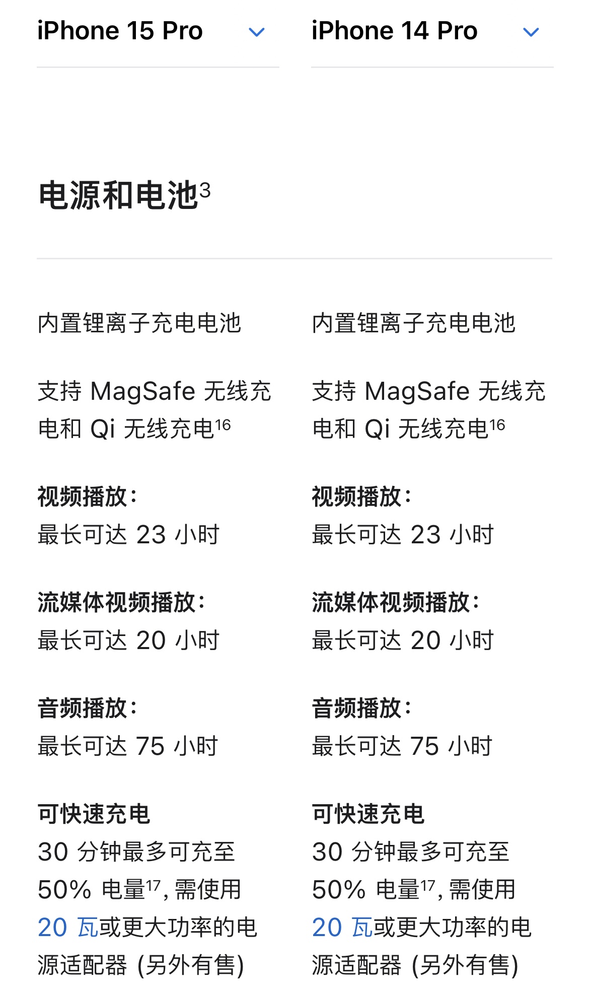 苹果iPhone 15系列发布之后,苹果官网发布了新机的要害标准。在续航方面,苹果虽然没有发布电池容量,但苹果给出了四款机型的清晰续航时刻,而且还标明晰续航提高起伏。动点科技记者在苹果官网发现,无论是 iPhone 15 仍是 iPhone 15 Pro,都和前代产品续航共同,包含快充方面,仍旧保持了上一年的水平,没有取得更大的晋级。