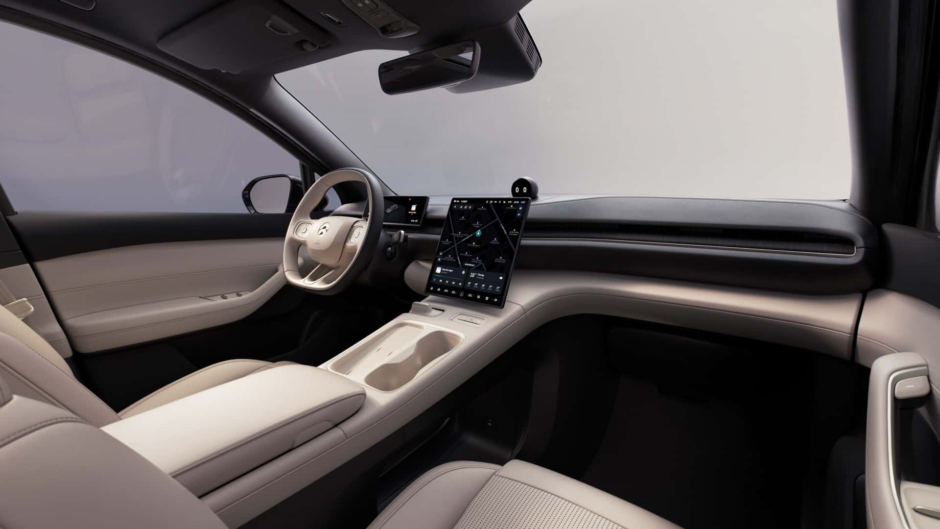 在内部,双层仪表板布局得以保存,但仪表板更纤薄,并具有躲藏的通风孔和新的中心信息文娱体系和驾驶员显示屏。信息文娱体系运转 Nio 最新的 Banyan OS。